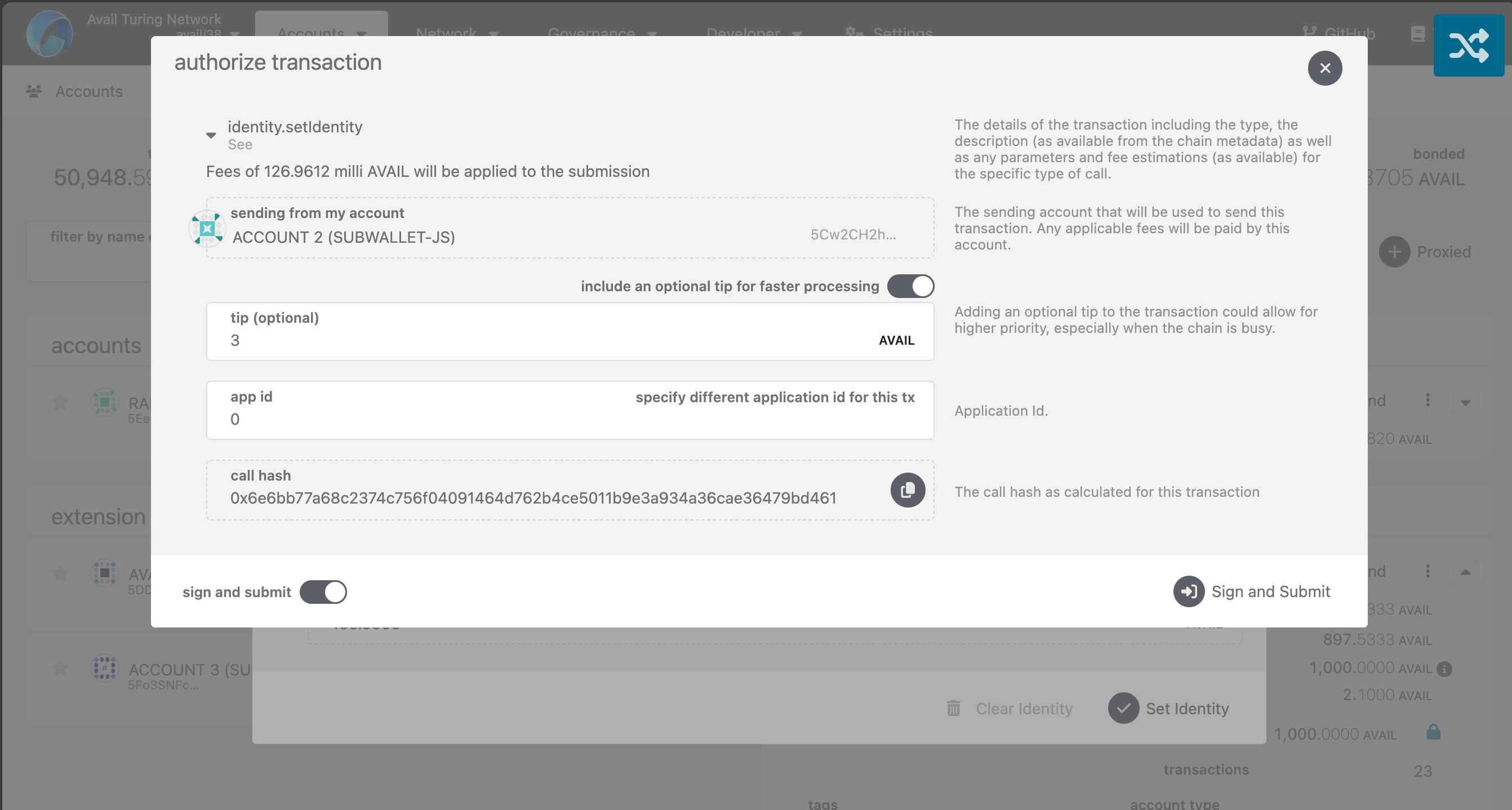 The account will now have a registered on-chain identity which you can clear to recover the bonded AVAIL tokens.